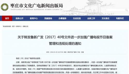 日前,枣庄市文化广电新闻出版局官网转发了《进一步加强广播电视节目备案管理和违规处理的通知》(以下简称《通知》),根据附件信息,该通知是由国家新闻出版广电总局下发。《通知》对重点节目的备案管理进一步强化,同时加大对违规节目的处理处罚力度。