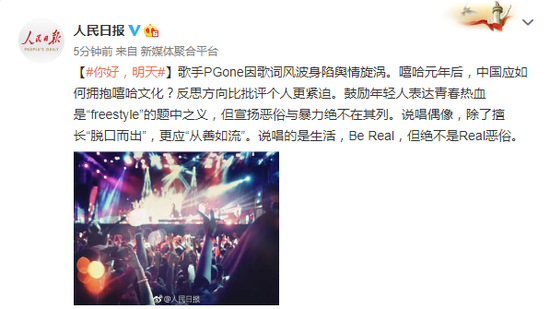 [#你好,明天#]歌手PGone因歌词风波身陷舆情旋涡。嘻哈元年后,中国应如何拥抱嘻哈文化?反思方向比批评个人更紧迫。鼓励年轻人表达青春热血是“freestyle”的题中之义,但宣扬恶俗与暴力绝不在其列。说唱偶像,除了擅长“脱口而出”,更应“从善如流”。说唱的是生活,Be Real,但绝不是Real恶俗。