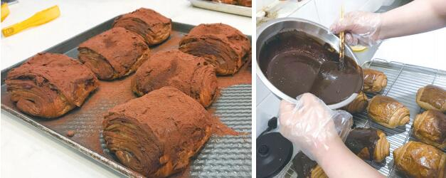 左图:外表又丑又脏的脏脏包,吃起来很美味;右图:面包师为刚刚烤好的脏脏包淋上巧克力酱。