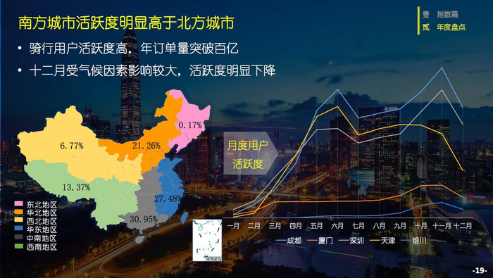 在地区分布上,全国六大区域骑行用户活跃度持续升高,其中,中南地区以30.95%的用户活跃度涨幅成为共享单车骑行热土,华东地区、华北地区紧随其后。值得注意的是,经过2017年的投放普及与市场沉淀,共享单车在全国范围内的地域布局呈现均衡化发展,在起步相对较晚的西北、西南和东北地区,骑行活跃度均呈现了较大幅度的增长,表明共享单车服务正逐步向二三线城市下沉,其中西南部地区骑行活跃度上升尤为明显。