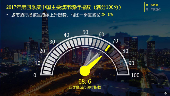 《报告》显示,2017年第四季度全国共享单车骑行活跃度持续上升,第四季度城市骑行指数增长至68.6分,较第三季度提升2.5分,上涨近3.8%,相比第一季度增长达28%。深圳成为第四季度全国城市骑行指数的第一名,珠海成为第四季度最大黑马、提升了超过16个名次。