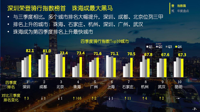 《报告》显示,与第三季度相比,第四季度多个城市的骑行指数排名中大幅提升,其中深圳以82.1的总分位列第一,荣登骑行指数榜首;成都、北京紧跟其后位列第二、第三;珠海、广州、上海、石家庄、杭州、武汉、昆明分别位列第四至第十名。其中,珠海从第三季度的20名之外攀升至第四季度的第四名,成为骑行指数排名上升最快的城市。