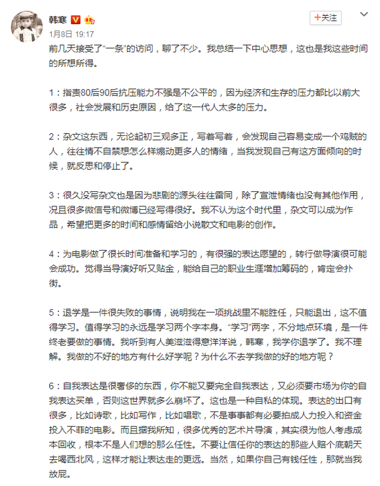 韩寒微博发文:退学是一件很失败的事
