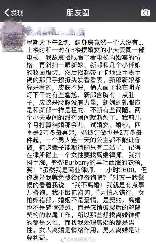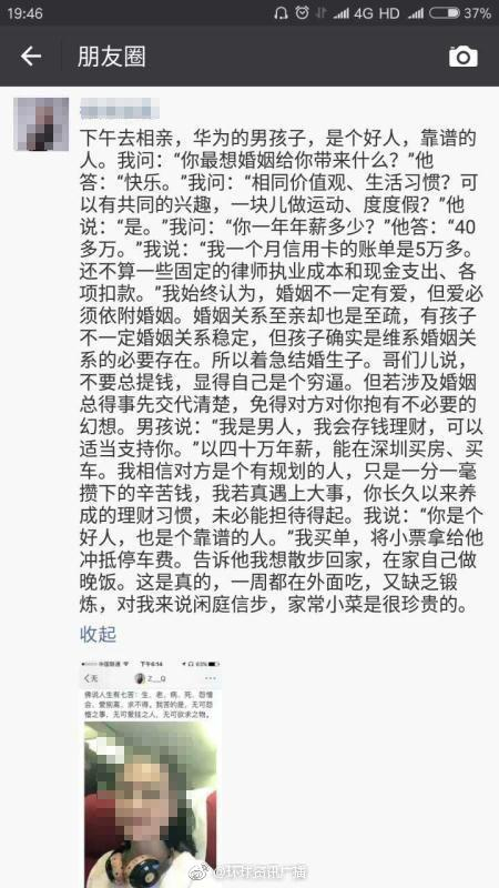 这两天,某知名律所的一位女律师火遍网络,其在朋友圈每次发表的大段文字都冲击着看官的眼球,她自称信用卡月账单至少五万,对年薪40万的相亲对象嗤之以鼻,还一直说喜欢温润如玉,会吃会玩,白净清瘦的小鲜肉,不爱大器晚成型。更是在朋友圈大秀自己的奢侈品,号称多家上市公司家族企业的股东追过她,而自己在网上二手贩卖的床单却是最普通的宜家床单,不禁令人感觉,太过给自己“加戏”。