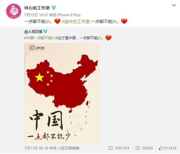 最后,网上公开资料显示,在2016年南海仲裁闹剧期间,身为台湾艺人的林心如与丈夫霍建华曾率先转发了支持中国维护南海主权的贴文,并因此在台湾遭到了台独势力的辱骂。