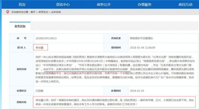 之后,在1月7日有关注这部剧的网友找到相关部门询问此剧为何下架,得到的回复则是:此剧可能存在不符合我国有关法规的情况,所以暂时下架。