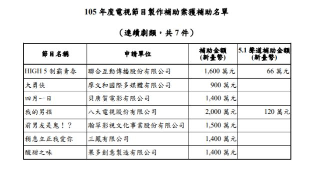 耿直哥调查也发现,与《我的男孩》同期获得台湾“文化部”辅助金的电视剧其实还有不少,具体名单如下: