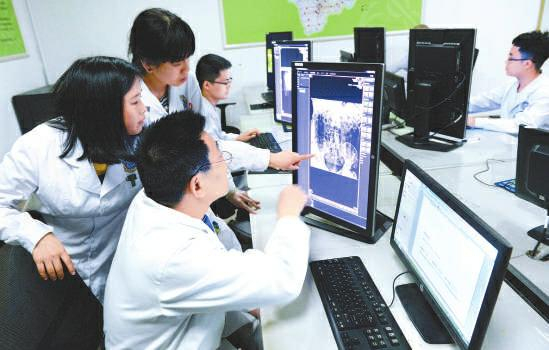 南充市临床医学影像诊断中心阅片室里,医生远程会诊偏远地区乡镇医院传来的患者影像资料。 (记者 李向雨 摄)