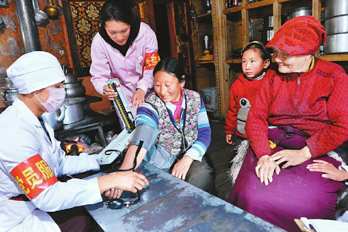 1月7日,在甘孜州白玉县麻绒乡麻绒村泽呷(左三)家,麻绒乡卫生院的医务人员为她体检。 (记者 李向雨 摄)