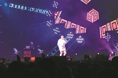 除了手上的结婚戒指,欧阳靖没有其他的装饰。满满两小时的舞台,他只换了三身衣衫。凭着天然的逗趣和控麦力,欧阳靖跑动得热汗涔涔。他说,“就算这是我的最后一场说唱会,也不会后悔。”