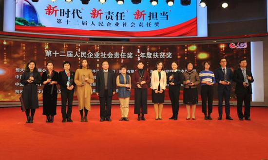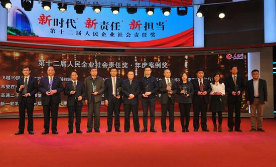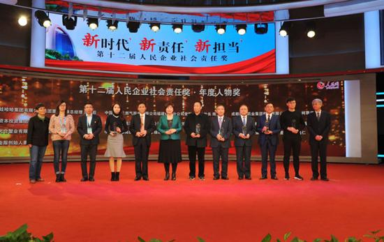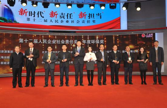 人民网北京1月11日电(初梓瑞)11日下午,由人民网主办的第十二届人民企业社会责任奖颁奖典礼在人民日报社新媒体大厦举行。本届评选以“新时代、新责任、新担当”为主题,评选出“年度企业奖”、“年度扶贫奖”、“年度人物奖”、“年度案例奖”和“年度环保奖”五大奖项,并发布了《2017年中国企业社会责任报告》。