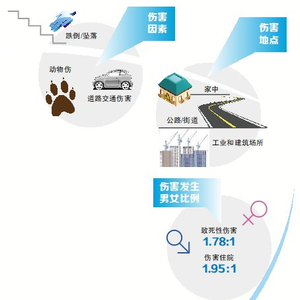 此外,在致死性伤害统计方面,2016年全年,伤害死亡占全市死亡总数的4.86%,居死因顺位第5位。致死性伤害男、女性别比为1.78:1。男女伤害住院病例比为1.95:1。平均住院费用为8674.63元/例,平均住院天数为9.3天/例。