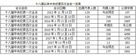 从出席代表看,十八大选举产生了130名中央纪委委员,因此二次全会应到人数为130人,实到129人,缺席了一人;而十九大选举产生了133名中央纪委委员,此次全会133人全部出席,无一人缺席。从上表可以发现,十八届中央纪委一共八次全会,竟无一次是应到的130人全部出席的;而本届已经召开的两次全会则都是悉数到齐,这从一个方面反映了中央纪委委员更加守纪律、讲规矩。