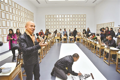艺术展上,市民可以用毛笔临摹、创作。