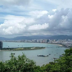 在三亚湾的东南方向,鹿回头风景区的北面,几座状如贝壳的巨大建筑矗立在一座人工岛上,这是三亚市的著名地标——凤凰岛。