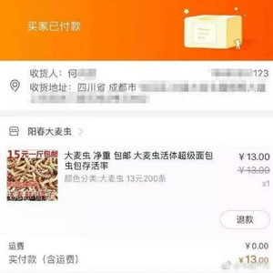 网友晒出的订单中,多是购买祭品和容易让人生厌的虫子寄给何某。记者联系到淘宝上一家卖大麦虫的淘宝店客服,客服称已经有四人在店内购买虫子寄给何某,客服称自己并不清楚成都摔狗事件。