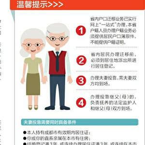 也就是说,父母投靠子女需要满足这些条件:父亲满60周岁,母亲满55周岁;父母在原籍地身边无子女;成年子女户口在本市;父母或其直系亲属在成都有住房。