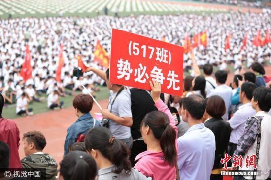 资料图:河北省衡水市第二中学2017级高一新生举行军训会操表演,家长们精心制作多种标牌、标语为孩子军训会操表演加油。 图片来源:视觉中国