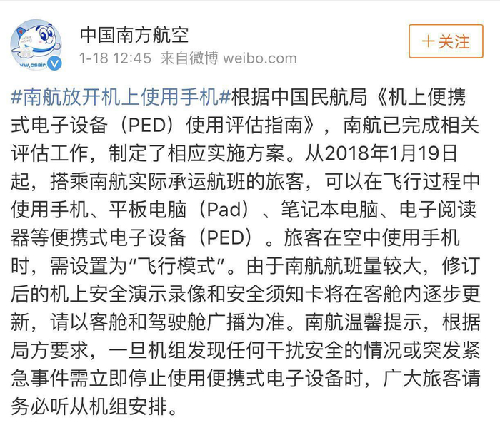 中午12:45,@中国南方航空发文称南航官方发文称,从2018年1月19日起,搭乘南航实际承运航班的旅客,可以在飞行过程中使用手机、平板电脑(Pad)、笔记本电脑、电子阅读器等便携式电子设备(PED)。根据中国民航局《机上便携式电子设备(PED)使用评估指南》,南航已完成相关评估工作,制定了相应实施方案。旅客在空中使用手机时,需设置为“飞行模式”。