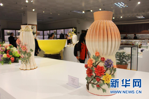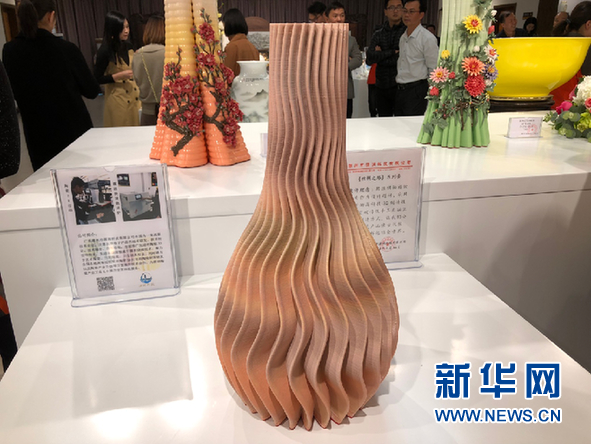 中国瓷都陈列馆展出使用“3D打印技术”制作的陶瓷花瓶。新华网发(官伟 摄)