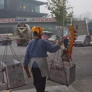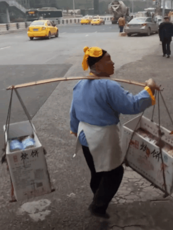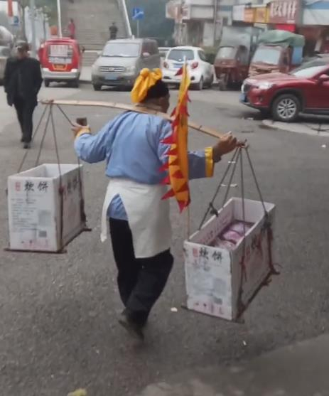 “武大郎”重庆街头挑担买饼 引路人侧目