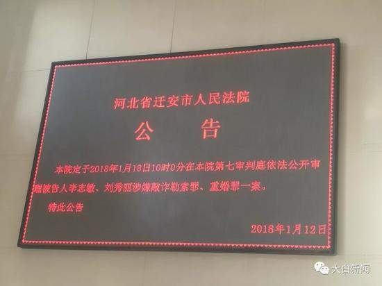1月18日,河北省迁安市人民法院副院长王子良担任李志敏、刘某丽涉嫌敲诈勒索罪、重婚罪一案的审判长。审判长在宣布法庭纪律、介绍16日召开的庭前会议相关情况等内容后,宣布开庭。随即又核对了被告人的基本情况,介绍了出席人员及合议庭成员以及告知被告人依法享有的权利。