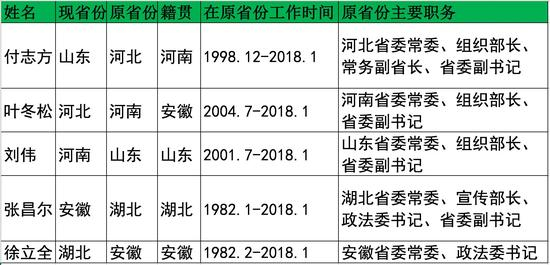 长安街知事(微信 ID:Capitalnews)发现,上述5位省政协领导在原省份的工作时间都比较长,最少者也有10余年。此外,对调的张昌尔和徐立全都担任过原省份的政法委书记,联动调职的刘伟、叶冬松和付志方都担任过原省份的组织部长和省委副书记。