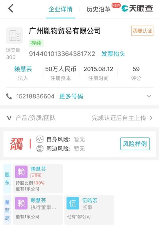 工商信息显示,广州胤钧公司法定代表人为赖慧芸,监事为伍皓宏。近日,界面新闻记者多次拨打赖慧芸电话并发送短信,希望能详细了解该事件的来龙去脉,但对方均未接听电话。