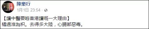 此事发酵后有网友爆出,他曾在社交媒体脸书上发表过“来大陆多了,心肠都恶毒了”的言论。不仅如此,去年10月,他还在浸会大学校园内张贴“港独”海报……