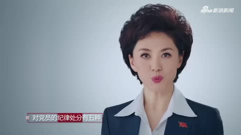 这段视频共1分21秒,海霞身着正装、胸带共产党员徽标,讲述党纪中对党员的5种纪律处分:警告、严重警告、撤销党内职务、留党察看、开除党籍。