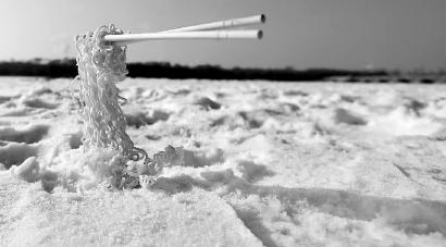 除了泼水,更有趣的是冻方便面。一桶方便面用一杯热水现场泡好,在空旷的南湖冰面上,挑起一筷子面,手停在半空,一分钟过去,面上已经有了冰碴儿,再一分钟,挑面的手已经僵硬,再看面,已经完全冻住,筷子和面可以轻松地立在冰面上,不用扶也不会倒,就那么静静地悬在了空中。