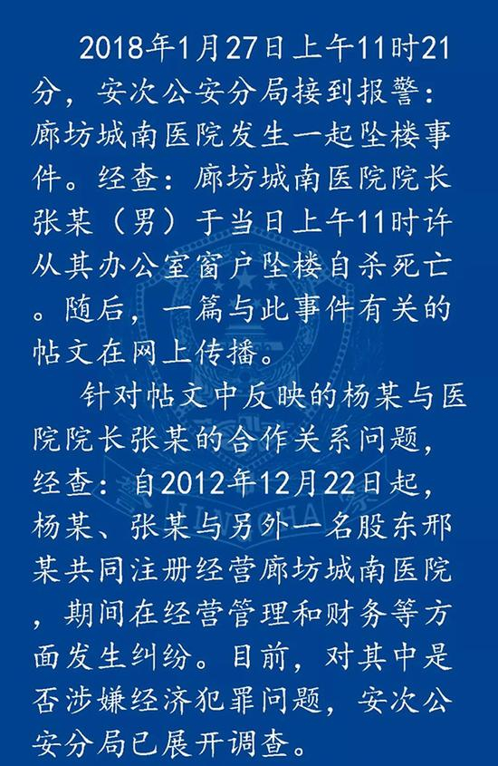 2018年1月27日上午,河北廊坊城南医院发生一起坠楼事件。廊坊城南医院院长张某于当日上午11时许从其办公室窗户坠楼自杀死亡。目前,廊坊市安次区警方在接警后立即就此事展开调查,现将最新情况进行通报: