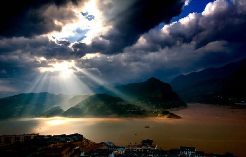 图片/朱云平阳光从云层的缝隙中倾泻而下,青山披薄纱,江水染鎏金,一幅画面处处景。 霞光万丈,流云似雪,从高处俯瞰山间云海,“上属于天,下见于渊,珍怪奇伟,不可称论。”“流景一何速,年华不可追。”诗人张循之咏诗感叹时光飞逝,并取景于巫山流云。