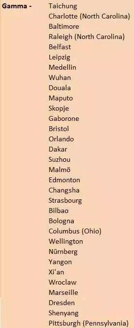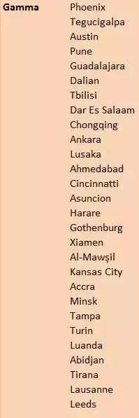 GaWC将世界城市分为四个大的等级:Alpha(一线城市)、Beta(二线城市)、Gamma(三线城市)、Sufficiency(自给自足城市,也可理解为四线城市)。