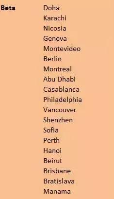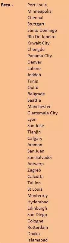 悉尼、圣保罗、米兰、芝加哥、墨西哥城、孟买、莫斯科、法兰克福、马德里、华沙、约翰内斯堡、多伦多、首尔、伊斯坦布尔、吉隆坡、雅加达、阿姆斯特丹、布鲁塞尔、洛杉矶。