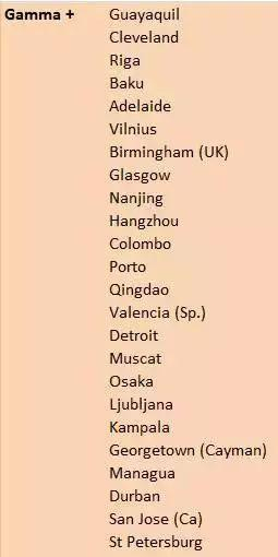 而每个大的等级中又区分出多个带加减号的次等级。在每个档内,分为最高级别++,和第二档+,无+,以及-档的标注,比如Alpha++就是第一档一线城市,Alpha是+第一档第二线城市。