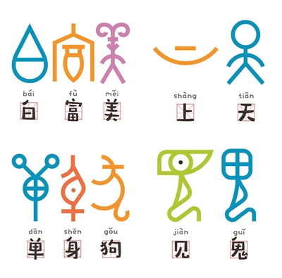 他从汉字的彩陶刻符中探索汉字雏形的设计规律,从甲骨文、金文、东巴文以及东亚汉字圈找出字形和书写工具的传承,又从擅长的装饰文字绘画、图形创意设计等方面,将传统汉字艺术化。