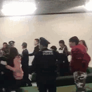 在中国驻日本大使馆的协调下,部分旅客听从引导,到航空公司介绍的附近酒店入住休息,另有100余名旅客坚持在登机口附近等候。25日凌晨,有位中国游客打算前往离境区内的二楼自动贩卖机处购买食品,却遭到航空公司职员阻止,叫他“别乱走”,引发其他旅客不满,与在场的两名工作人员起了言语争执,随后发展为肢体冲突。警方接到报警后到场处理,有在场乘客要求派中文翻译前来,以配合警方调查,但警方没有理会,并试图带走其中一名中国游客,该游客衣服也被扯烂,现场一片混乱。期间有游客唱起《义勇军进行曲》进行抗议。其间,一名游客与工作人员发生冲突,机场警察到场处理并带走该旅客,也是这个过程中有游客唱起了《义勇军进行曲》。