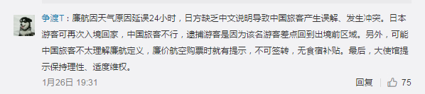当地时间 1月24日晚,原定晚9点45分从东京成田机场起飞的捷星航空公司GK35航班因目的地上海降雪取消。乘坐该航班的175名中国旅客滞留机场登机口区域。该航空公司要求旅客离开登机区域,但并未用中文说明机场规定该区域23点后将关闭,导致中国旅客不接受航空公司安排。