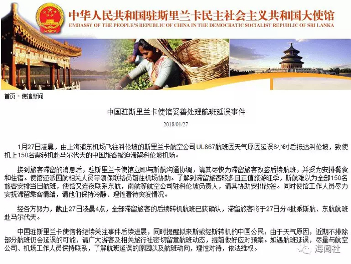 1月27日凌晨,由上海浦东机场飞往科伦坡的斯里兰卡航空公司UL867航班因天气原因延误8小时后抵达科伦坡,致使机上150名需转机赴马尔代夫的中国旅客被迫滞留科伦坡机场。