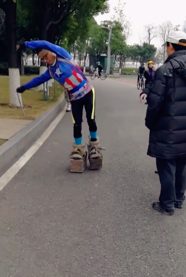 大叔穿“钢铁鞋”走路 重达百斤引路人好奇