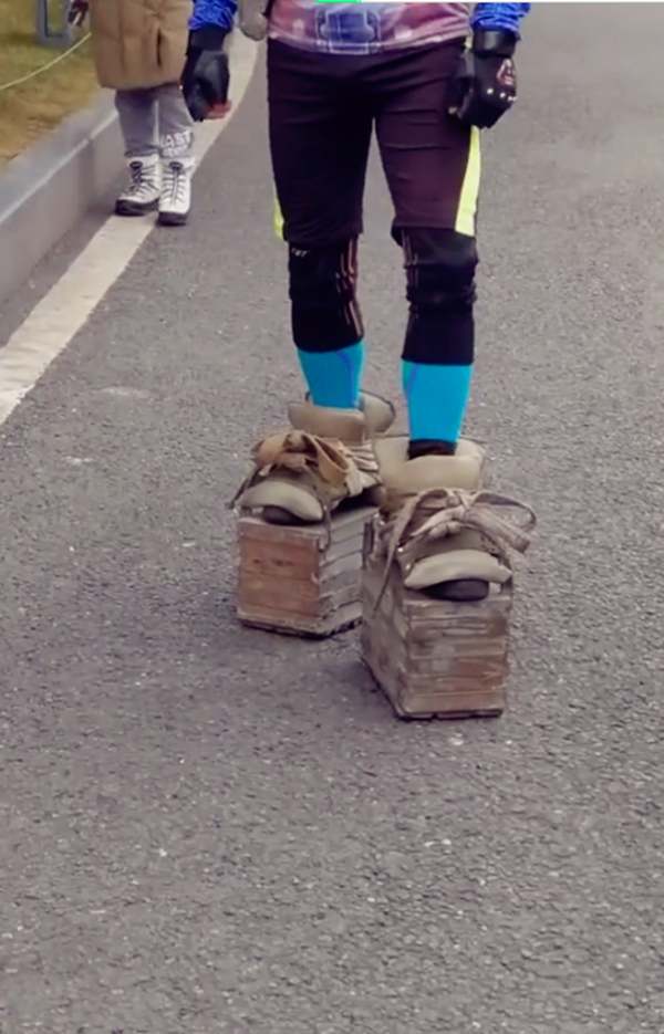 可大叔的鞋子非常特别,目测鞋底约有半米高,用绳子绑在脚上固定住。大叔每走一步都显得十分用力,走走就要歇歇,然后再继续走。