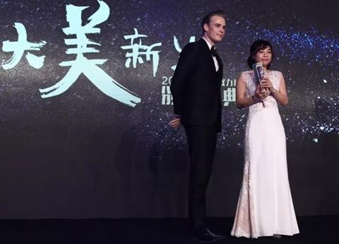 图 / 无休国际文化传媒有限公司国际部总裁大牛(左)为德丰影业股份有限公司董事会秘书王思维(右)颁奖