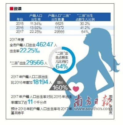 根据东莞市卫生计生局统计,2017年度,全市户籍人口出生46247人,出生率22.25‰。其中“二孩”出生29566人,“二孩”出生占新生儿比例约为64%。也就是说,在东莞,降生的5个新生儿中,就有3个是“二孩”。而在2016年,户籍人口“二孩”仅为11372人。