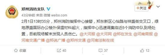 2月1日13时35分,郑州消防指挥中心接警,郑东新区心怡路与祥盛街交叉口,绿地原盛国际办公楼外保温材料起火,指挥中心迅速调集临近8个消防中队到场处置,目前现场暂未发现人员伤亡。
