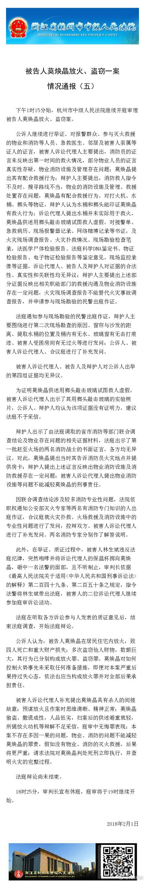 下午1时15分始,杭州市中级人民法院继续开庭审理被告人莫焕晶放火、盗窃案。