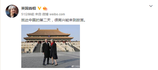 海外网2月1日电 英国首相特雷莎·梅自1月31日起对中国进行为期三天的国事访问。1日,英国首相官方微博发布一张特蕾莎·梅和丈夫菲利普参观故宫的照片,并配文表示:“抵达中国的第二天,很高兴能来到故宫。”