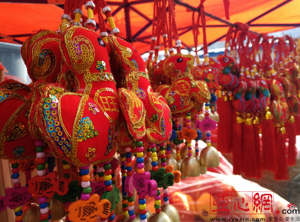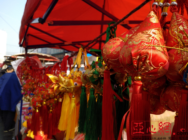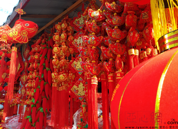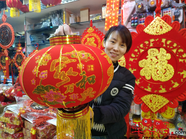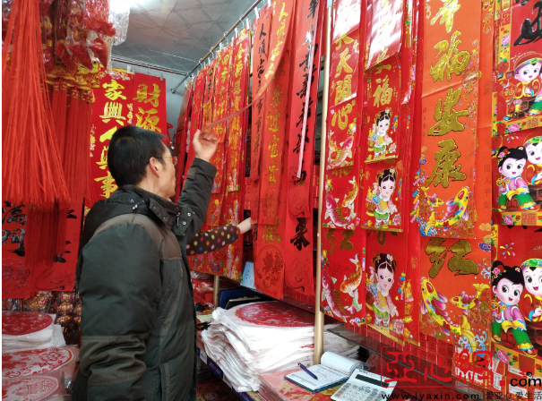 从精巧可爱的剪纸福字、三层立体福字门贴、金碧辉煌的壁画式福字、中国结挂件、年年有鱼挂饰,到闪亮红火光彩夺目的烫金、浮雕、金粉、镭射、绒布等各式春联,新颖的样式,齐全的种类,烘托出十足的年味儿。