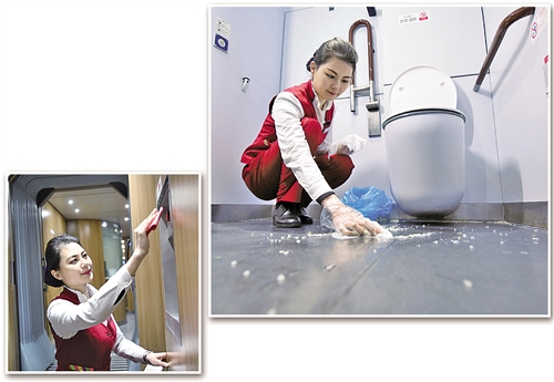 “高姐”早已成为列车上一道靓丽的风景,但在众多“高姐”中,有这样一个不为人注意的岗位——随车保洁员。她们是一天当中进出卫生间最频繁的人。近日,记者跟随山东济铁旅服公司“90后”高铁随车保洁员高广平的脚步,体验了一趟她的春运值乘工作。