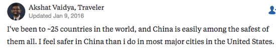 当然,在中国旅游对老外的吸引力不只是便捷。一位去过全世界二十多个国家的外国驴友总结说,“中国是我去过的最安全的国家之一。我感觉在中国的大型城市比在美国安全多了。”